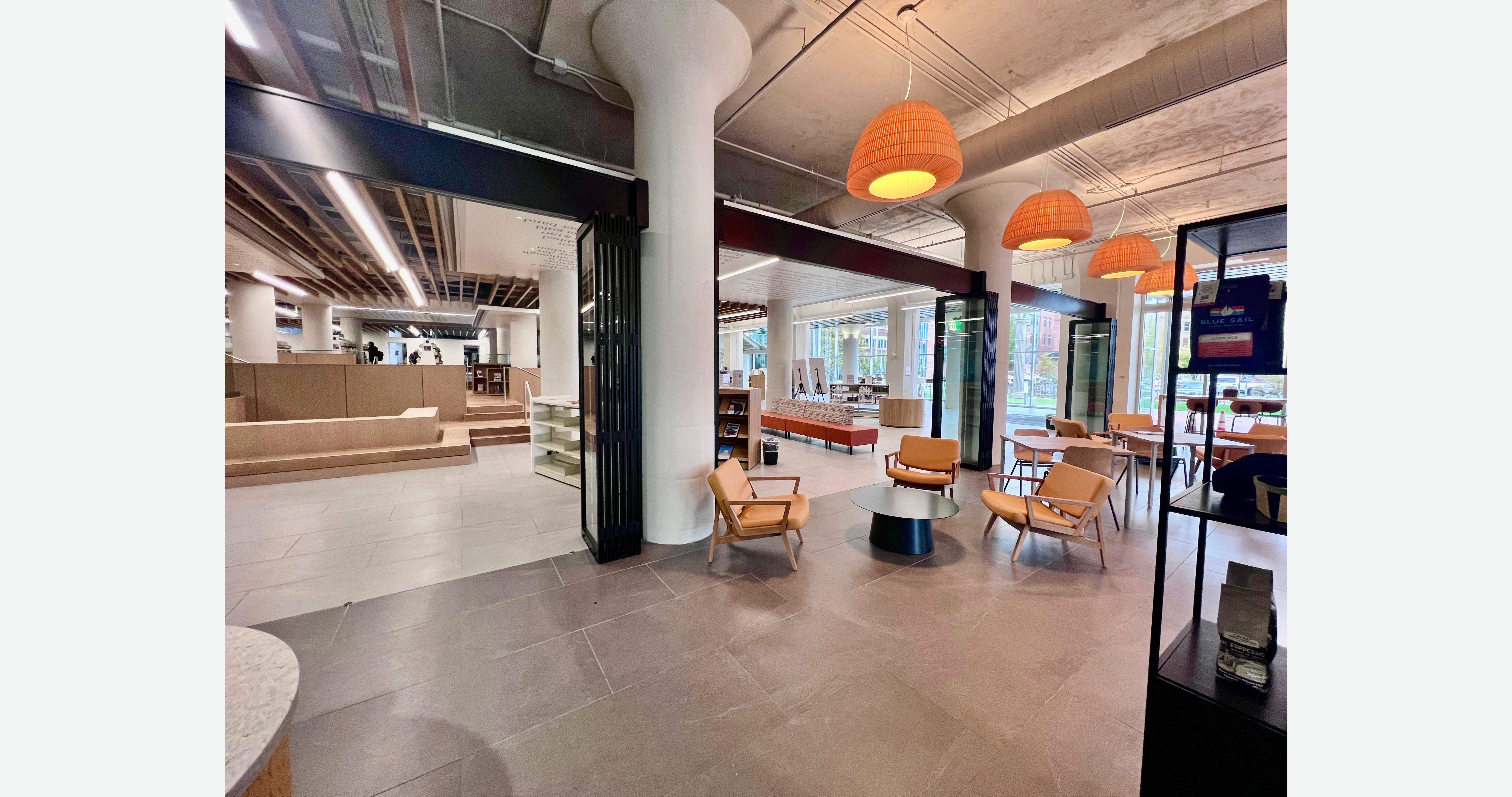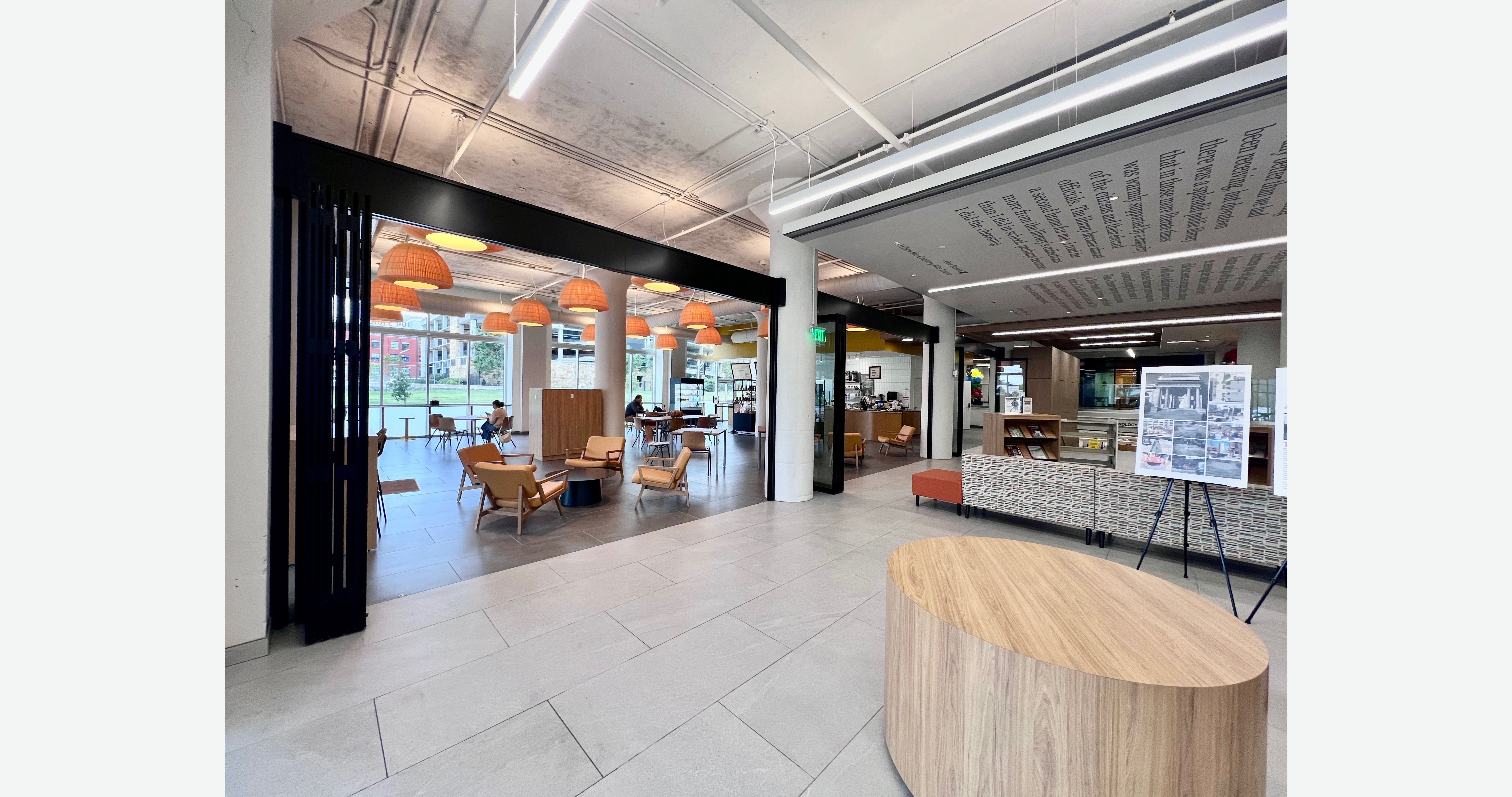 The architect’s vision centered on a flexible, resilient public space: a light-filled lobby and café that could operate independently or open fully to the main library to support future programming needs. The solution needed to: