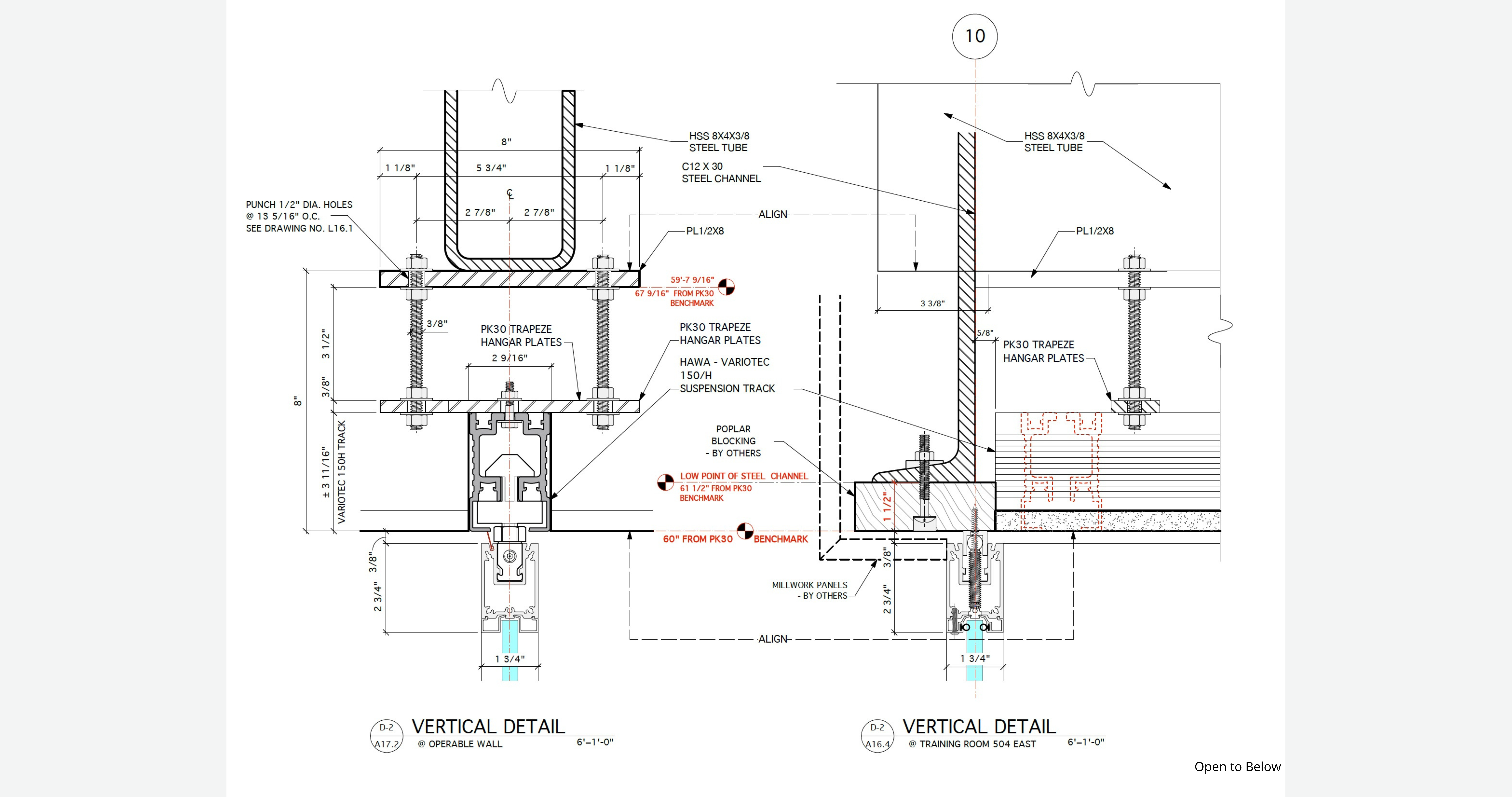 The track was trapeze-supported from structural steel above the finished ceiling. Every dimension had to reconcile with ceiling height, blocking, and adjacent return walls. Panels disengage from the track during stacking and pivot into position—requiring precision coordination between hardware and structure. PK-30 anchored into contractor-installed poplar blocking, suspended the track from structural steel, embedded the track above the finished ceiling, and maintained a consistent finished height throughout. The system was fabricated at one consistent height; field conditions were reconciled through engineering—not fabrication compromise.