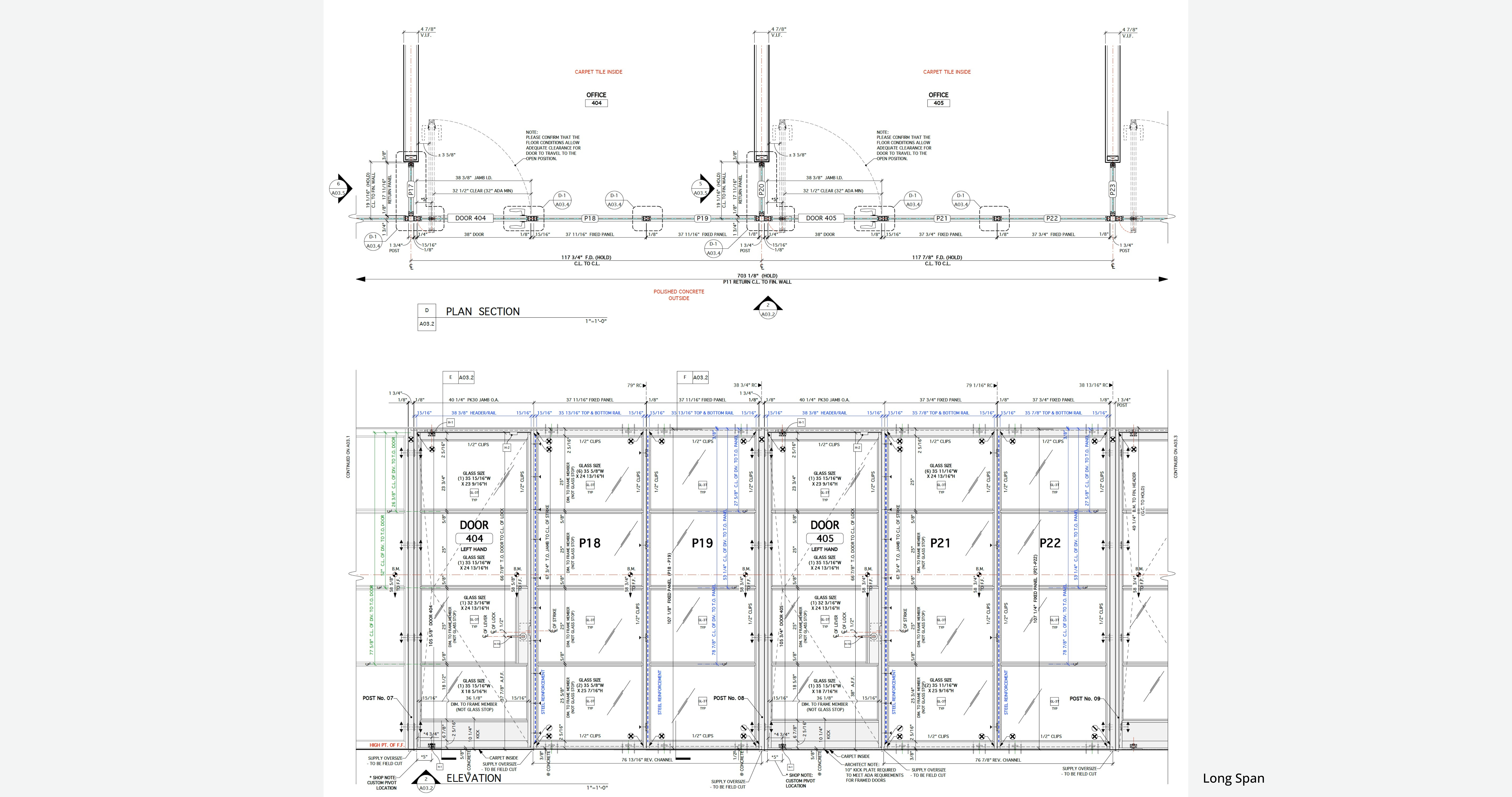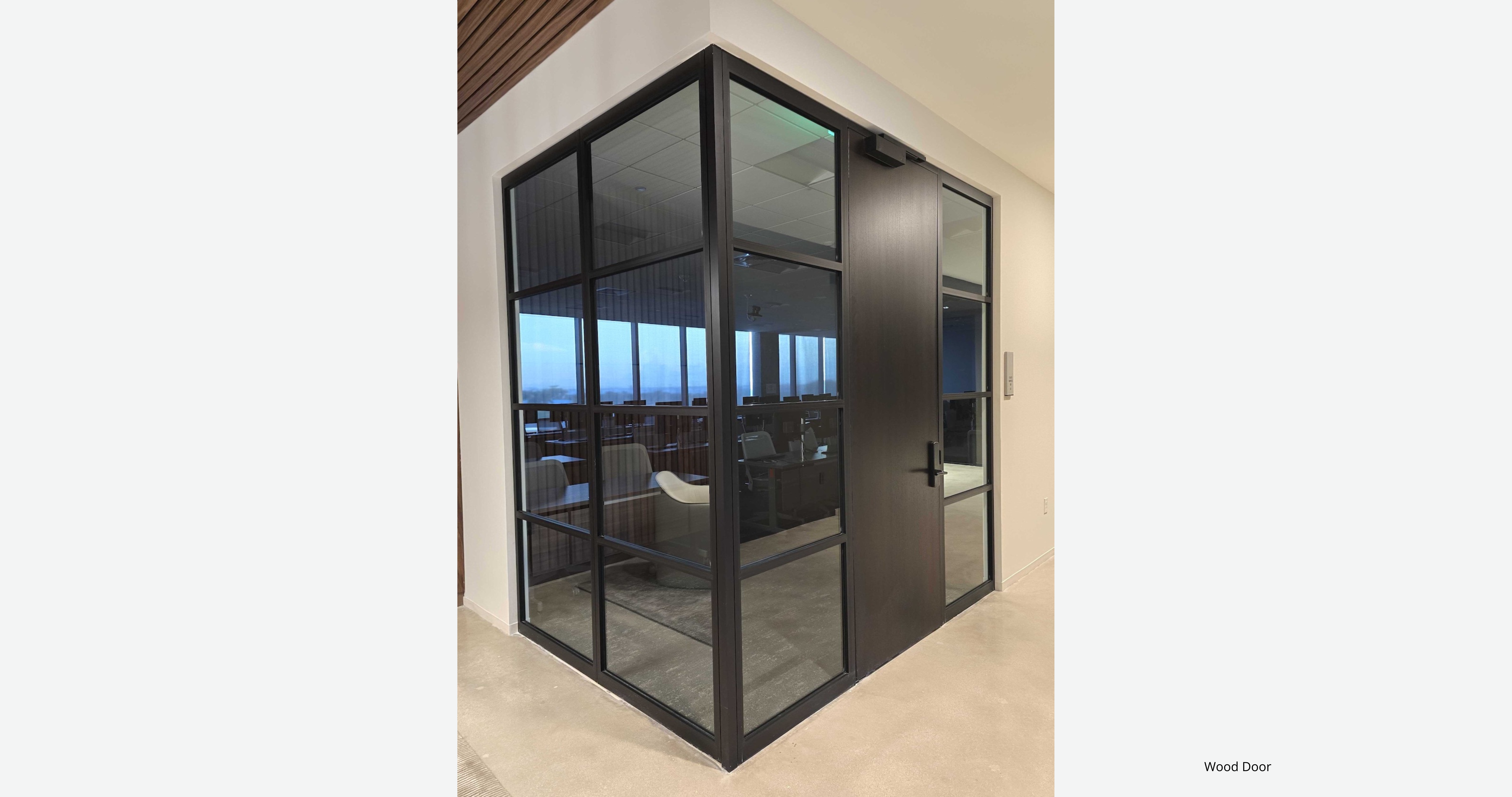 Several elevations extended up to 95 feet in continuous glazed runs. These were not small partitions—they were architectural spans demanding alignment control and visual continuity over distance. PK-30 engineered 1-3/4″ structural posts at return conditions, fly-back return panels tying into adjacent walls, integrated swing doors within long glazed systems, and L-shaped and horseshoe return geometries. Maintaining tolerance over these distances required fabrication discipline and precise installation sequencing. The result: a seamless visual plane across the full span.