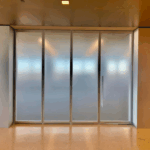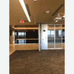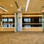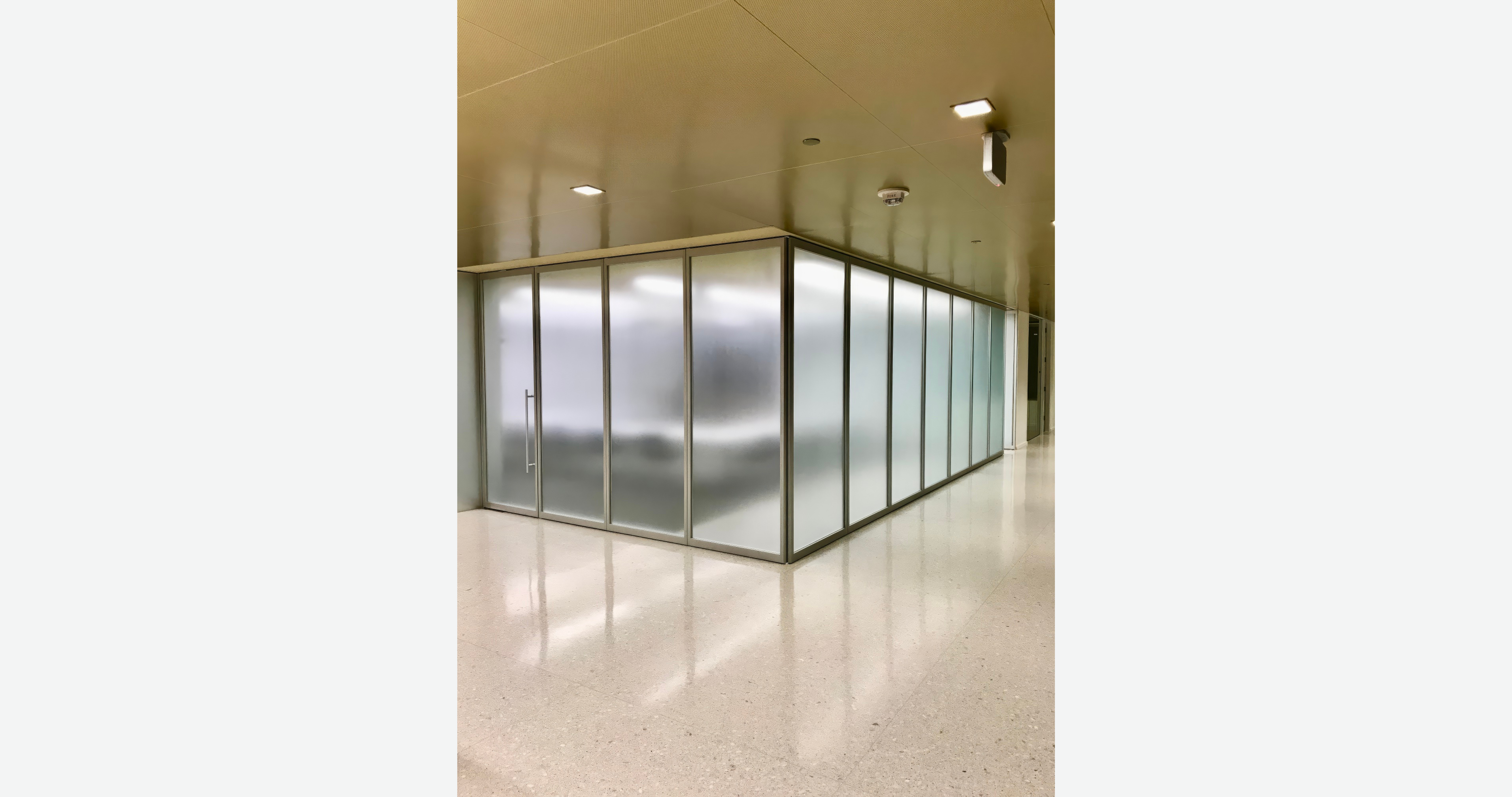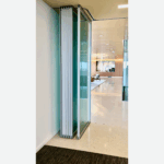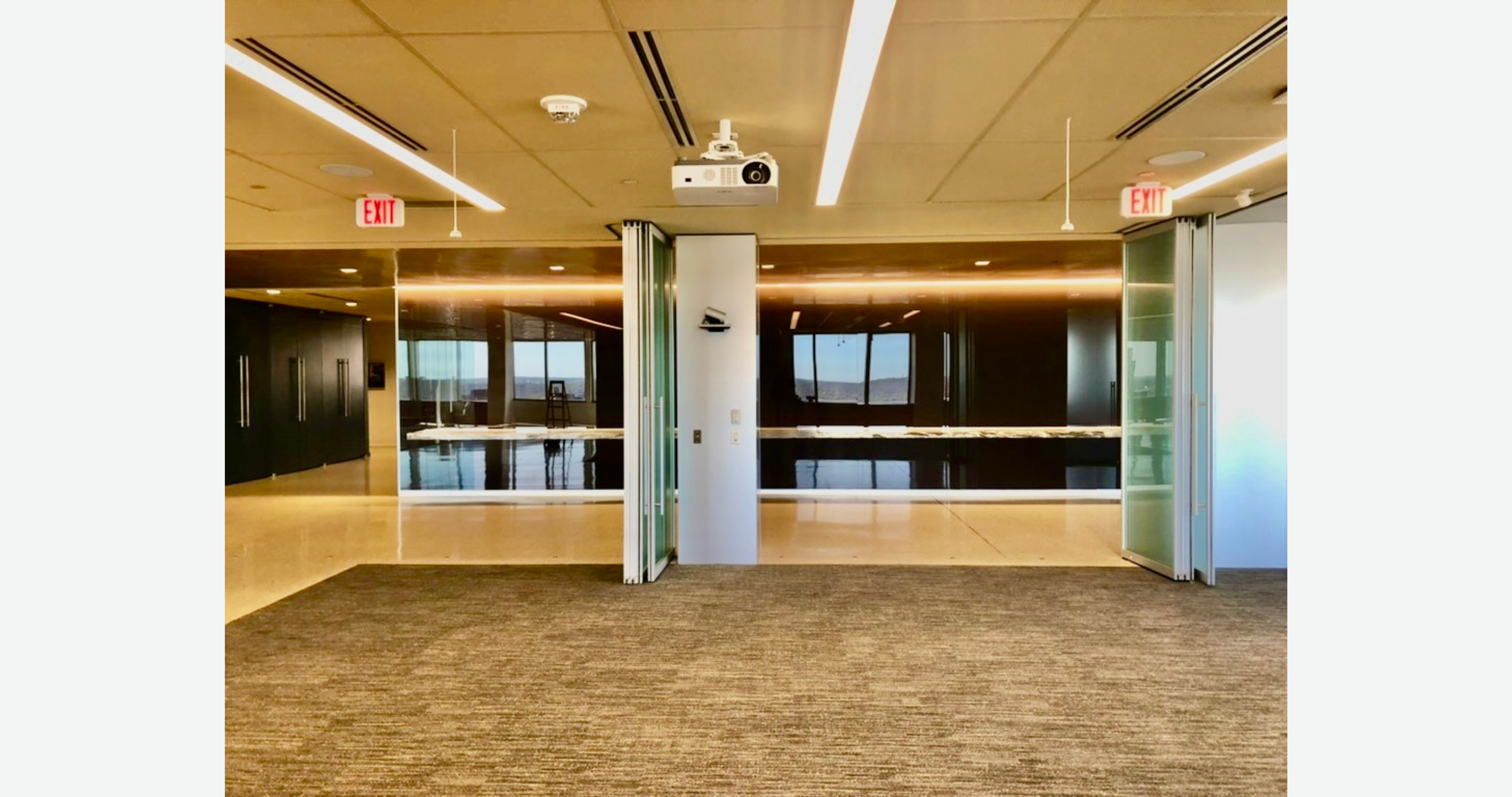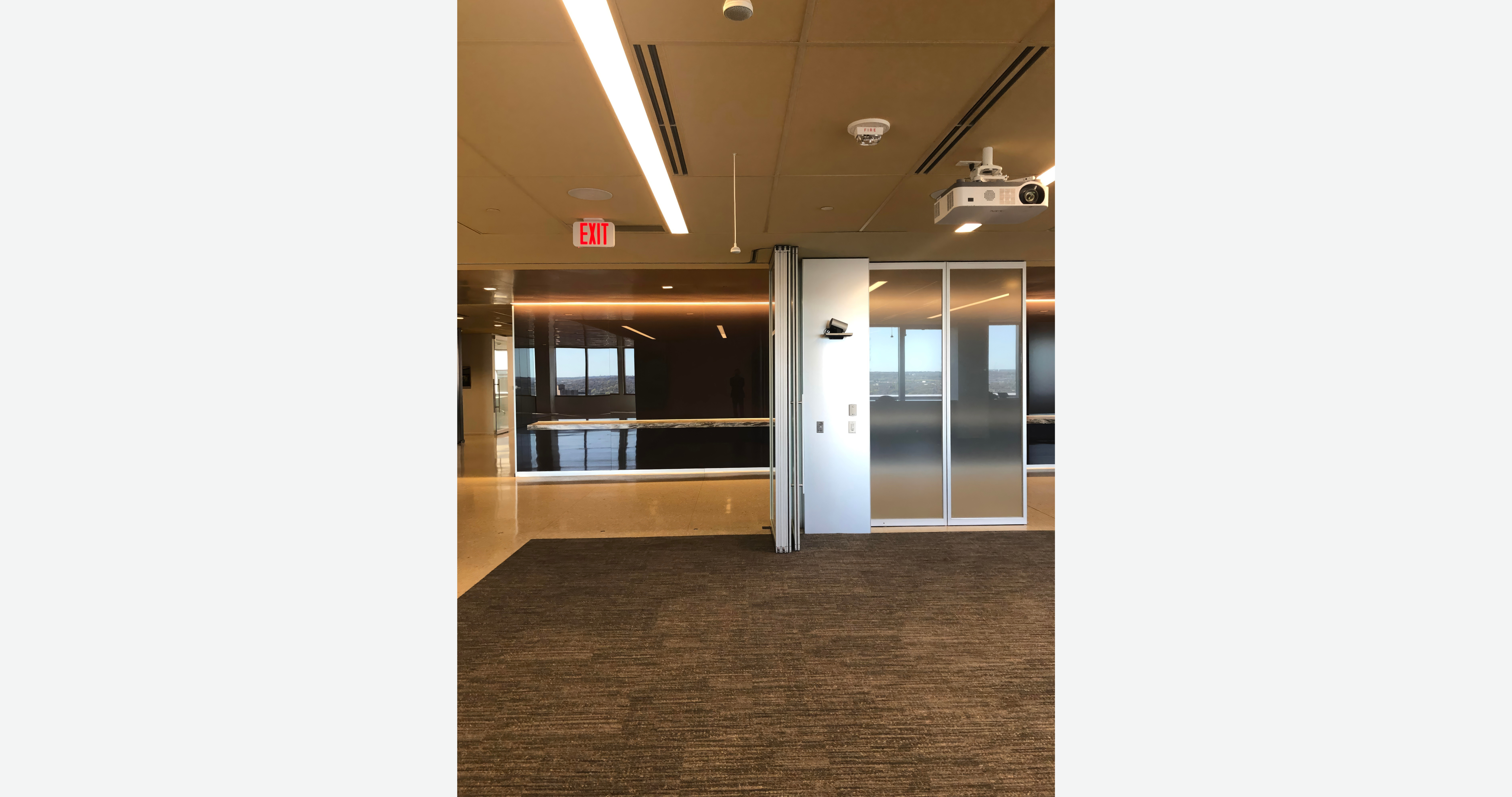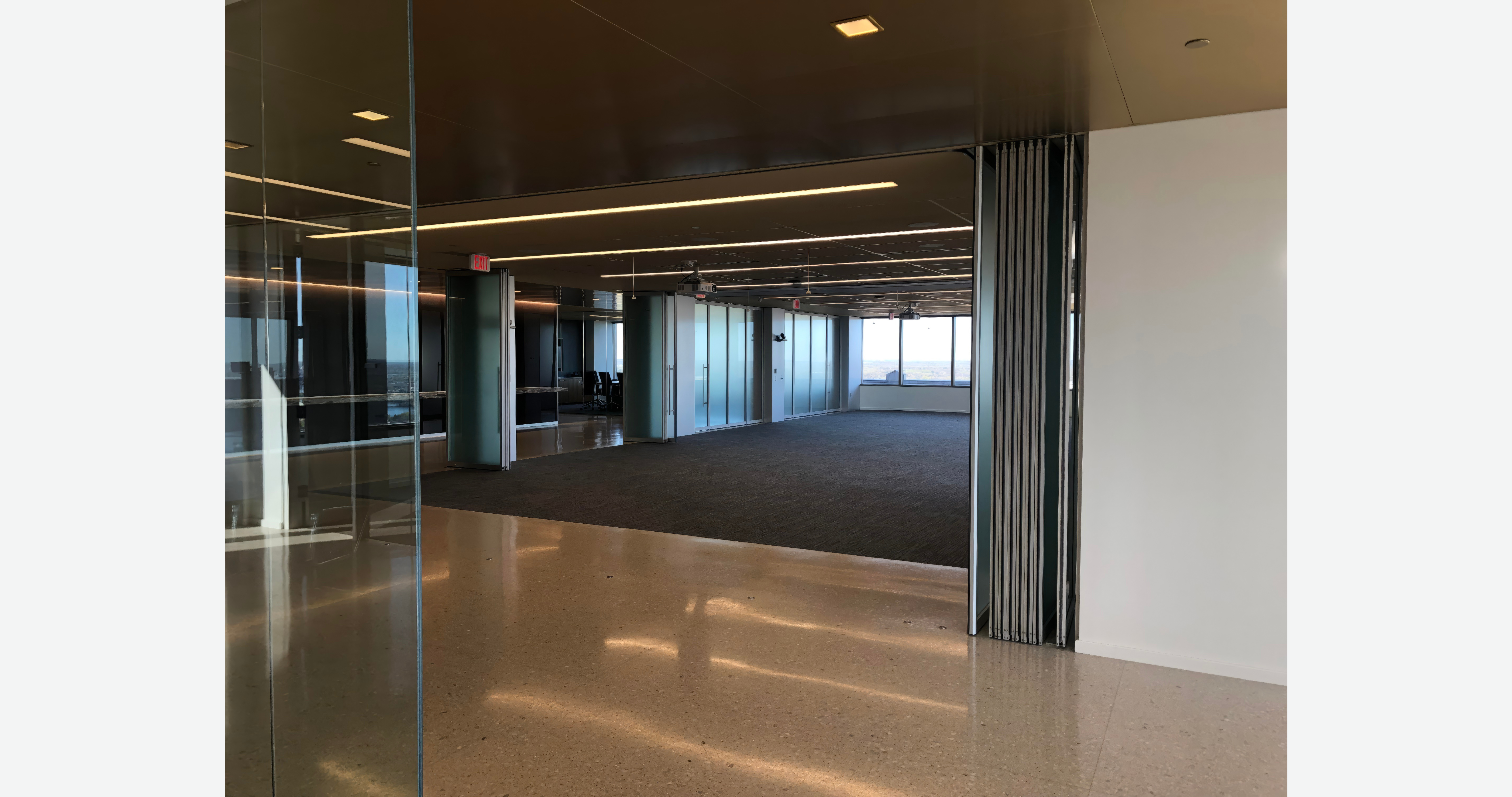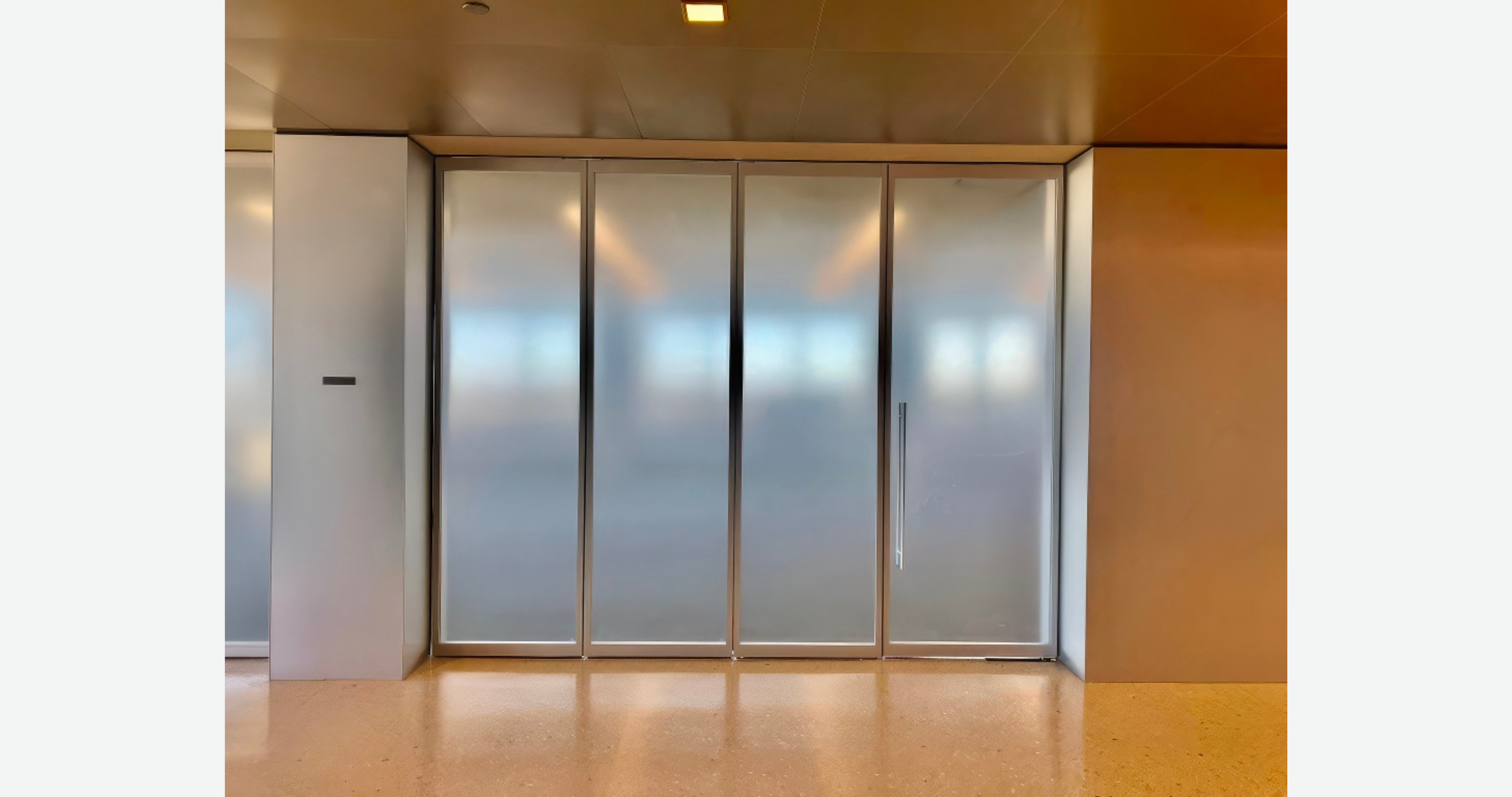 The installation included a total of 80 linear feet of glazed partitions, integrating both sliding/stacking panels and swing doors: